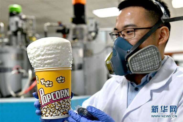 在烟台万华化学集团中央研究院先进表面材料中心,工作人员陈丁丁在做聚氨酯发泡实验(2018年12月8日摄)。新华社记者郭绪雷 摄